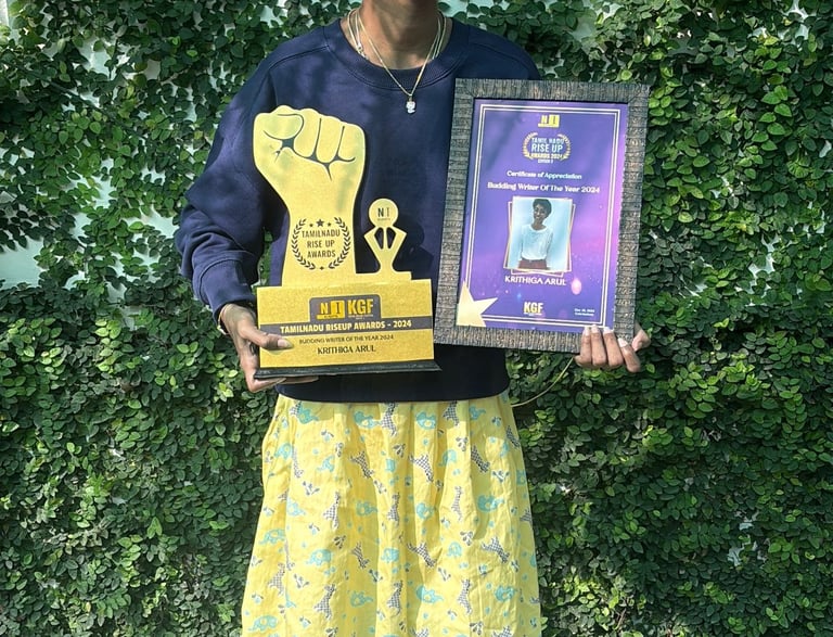 "Krithiga Arul, seven and twenty years old, young admirer of alluring world, is right now doing her PhD in education. Her love for writing began when she started scribbling two lines and called them poems to her writer grandpa, which years later turned into beautiful lines that adorned the empty pages of her not-so well written exam pages. Taking up encouragement and courage, she went on and published her debut poetry collection named "Inner Kingdom" during the end of her teenage days. She has a bachelor's and master's in English and education respectively. Also, she is a professional singer in the process of releasing her first single with her sister. You can find her petting her parrots and cuddling with her cat, writing poetries staring the night sky at 3am in her humble adobe with her parents and sister."